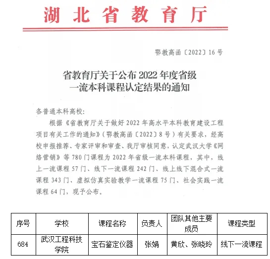 近日,湖北省教育厅公布了2022年度省级一流本科课程认定结果,我校张娟老师牵头申报的《宝石鉴定仪器》课程获批认定为2022年度省级一流本科课程。